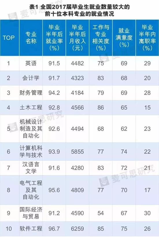 麥可思最新數(shù)據(jù)顯示,2017屆畢業(yè)生就業(yè)數(shù)量較大的十個(gè)本科專(zhuān)業(yè)分別是:英語(yǔ)、會(huì)計(jì)學(xué)、財(cái)務(wù)管理、土木工程、機(jī)械設(shè)計(jì)制造及其自動(dòng)化、計(jì)算機(jī)科學(xué)與技術(shù)、漢語(yǔ)言文學(xué)、電氣工程及其自動(dòng)化、國(guó)際經(jīng)濟(jì)與貿(mào)易、軟件工程。